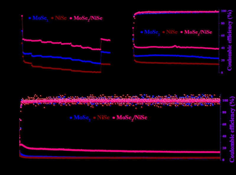 图2 MoSe2,NiSe和MoSe2/NiSe的(a)倍率性能(b)小电流循环性能和(c)大电流循环性能