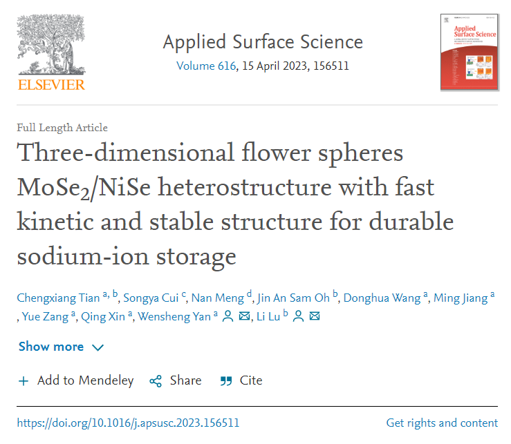 新型储能电池研发对加快实现我国碳达峰、碳中和战略目标具有重大意义。近日,我校碳中和新能源研究院严文生和田成祥团队在下一代新型储能电池—钠离子电池领域取得了阶段性进展。相关研究成果以久久精品一区二区为第一单位,发表在能源类Top期刊Applied Surface Science(影响因子7.4),题目为Three-dimensional flower spheres MoSe2/NiSe heterostructure with fast kinetic and stable structure for durable sodium-ion storage,论文第一作者为青年教师田成祥,严文生教授和Lu Li教授为共同通讯作者。