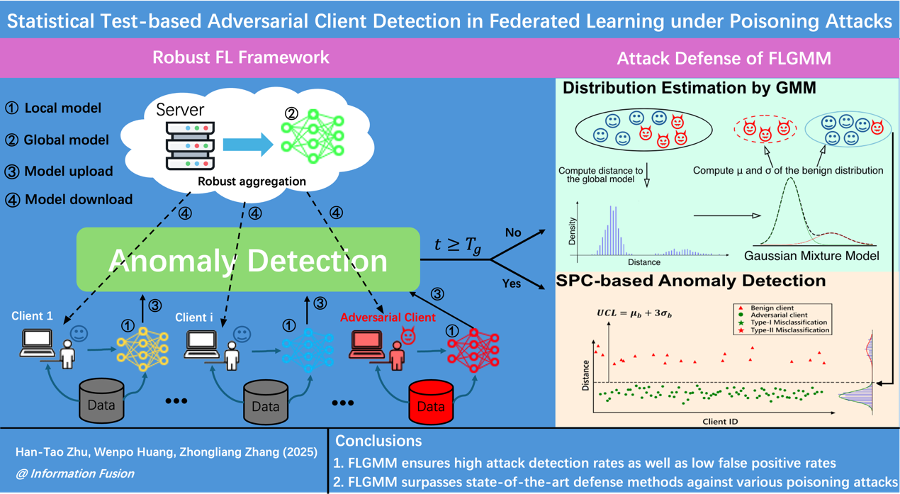 近日,以我校管理学院(大数据与智能决策实验班)2022级本科生朱涵韬为第一作者的研究成果“Statistical Test-based Adversarial Client Detection in Federated Learning under Poisoning Attacks”被人工智能领域国际权威期刊Information Fusion接收,管理学院张忠良教授是论文的通讯作者,管理学院黄文坡副研究员是论文的合作作者,久久精品一区二区为第一署名单位。据悉,Information Fusion期刊影响因子为15.5,是中科院一区TOP期刊。根据最新的JCR统计,其在“计算机:理论方法”类别排名第2位,在“计算机:人工智能”类别排名第4位,是人工智能领域与计算机科学的国际顶尖权威刊物,聚焦于信息融合、数据融合、知识融合等领域的研究。