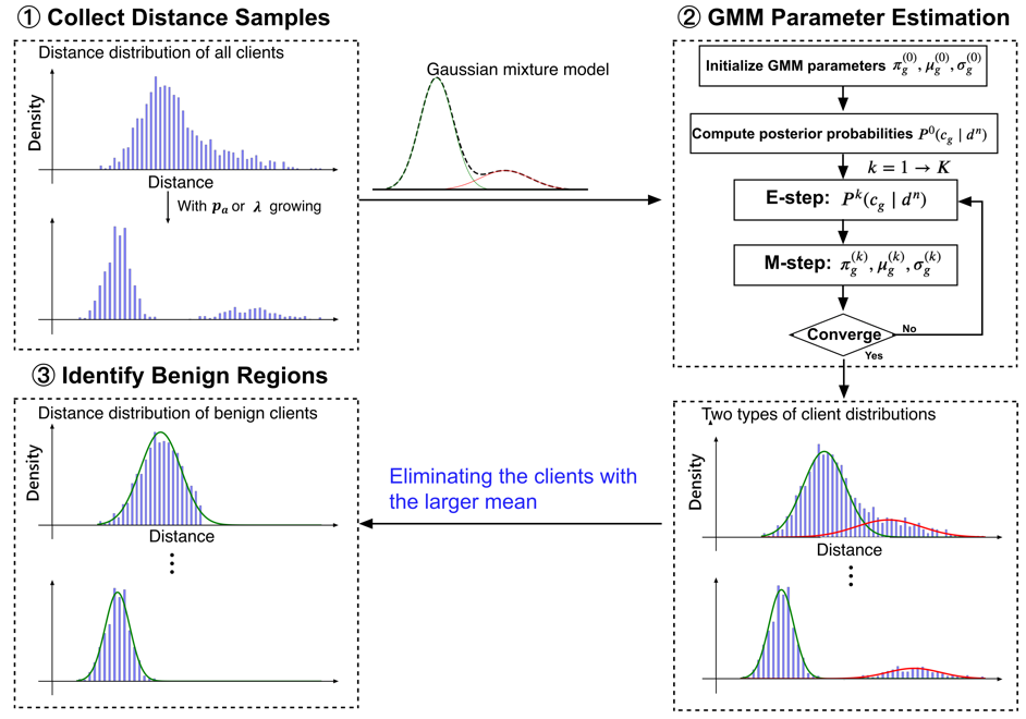 针对安全挑战,该研究工作提出了一种名为FLGMM的基于统计控制的联邦学习恶意参与方检测方法,首次将统计过程控制理论引邦学习参与方选择领域,用以防御拜占庭投毒攻击。FLGMM主要包含分布估计、控制限建立和恶意参与方识别三个阶段。